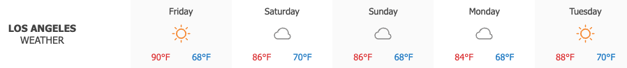 Los Angeles saw sunny skies on Friday, with highs reaching 90°. Cloudy conditions are expected Saturday, when temperatures will top out at 86°.