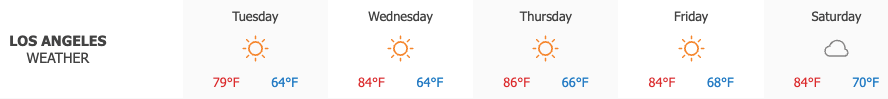 Los Angeles saw sunny skies on Tuesday, with highs reaching 79°. Sunny conditions are expected on Wednesday, when temperatures will climb to around 84°.