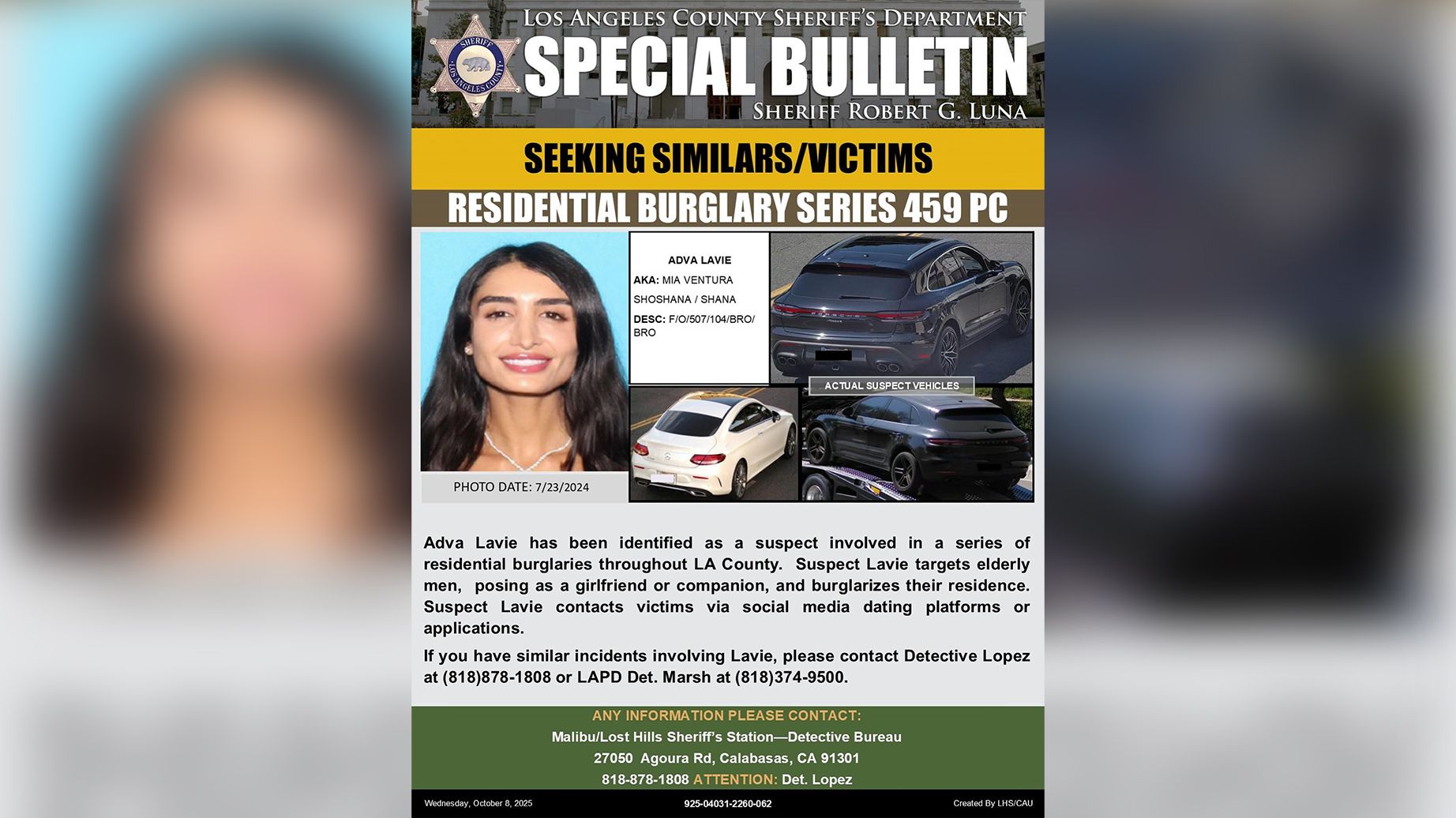 A Los Angeles model and influencer, Adva Lavie, also known as Mia Ventura, has been indicted on multiple felony charges after prosecutors say she used dating apps to target and rob wealthy men. Authorities allege the crimes took place in Malibu and Calabasas, where Lavie is accused of gaining access to victims’ homes before committing theft. She has pleaded not guilty and is currently out of custody with an ankle monitor ahead of her April court date.