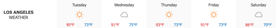 Los Angeles saw sunny skies on Tuesday, with highs reaching 95°. Cloudy conditions are expected on Wednesday, when temperatures will top out at 91°.